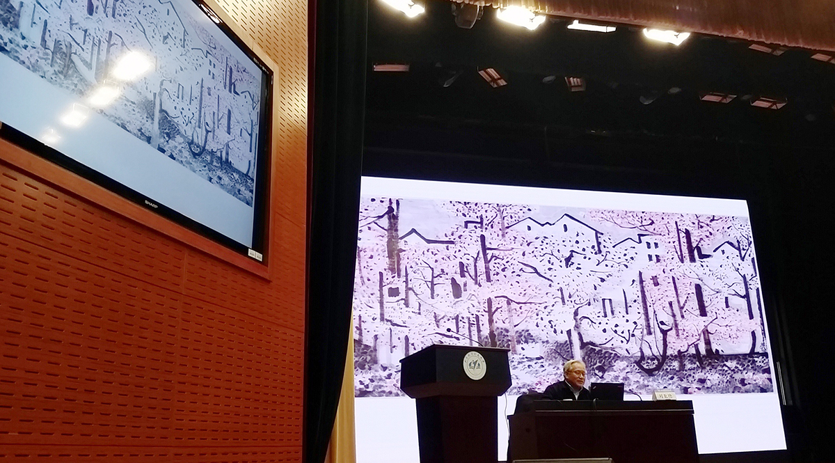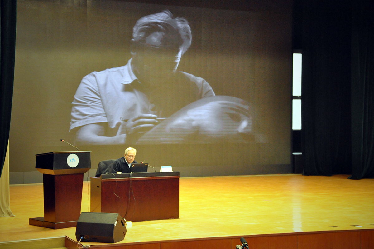 刘巨德教授由浑沌之美展开,进一步就“浑沌是不可改造的”、“浑沌呈内直觉”、“浑沌无分别”、“浑沌至善”等四个方面,系统阐释了他对美术创作、审美理念和艺术生命精神等的独特见解。结合对“混沌美神”的认知,他从林风眠谈到庞薰琹、吴冠中,从塞尚谈到毕加索,从李政道谈到艺术与科学的结合,并通过展示数十件自己的绘画、陶瓷、雕塑等作品和艺术创作视频纪录片,阐释了中国传统文化中蕴含的美学思想,让同学们在得到充分的视觉享受和审美体验的同时,进一步领悟了浑沌之美。