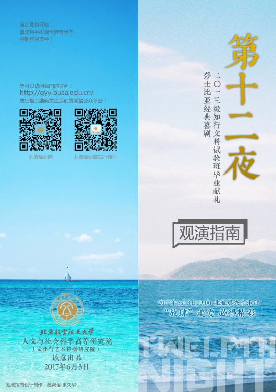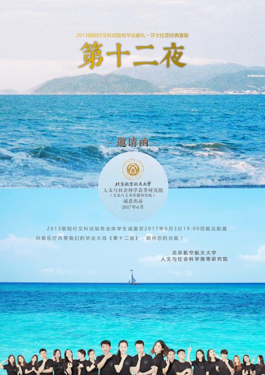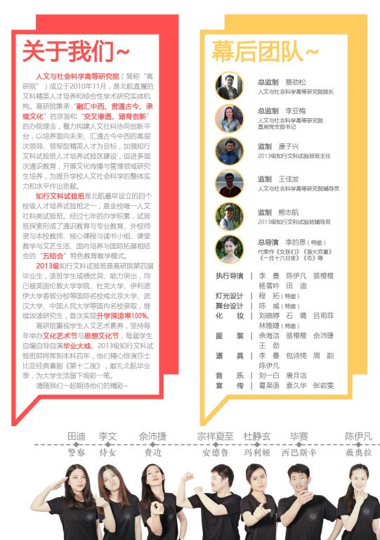 “知行文科试验班”是北航最早设立的四个校级人才培养试验班之一,也是全校唯一人文社科类试验班。该试验班在本科一年级结束前夕,从全校所有文科学生中择优选拔30名优秀学生组建,有针对性地进行通识教育及综合能力培养。经过7年的办学积累,“知行文科试验班”探索形成了“通识教育与专业教育相结合、外校师资与本校教师相结合、核心课程与读书小组相结合、课堂教学与文艺生活相结合、国内培养与国际拓展相结合”的“五结合”特色教育教学模式。高研院重视学生人文艺术素养提升,“知行文科试验班”坚持每年举办文化艺术节、思想文化节,丰富学生的文化艺术生活。每届毕业班学生均自编、自导、自演毕业大戏,迄今已在北航音乐厅上演《仲夏夜之梦》《威尼斯商人》《皆大欢喜》等莎士比亚经典剧目。