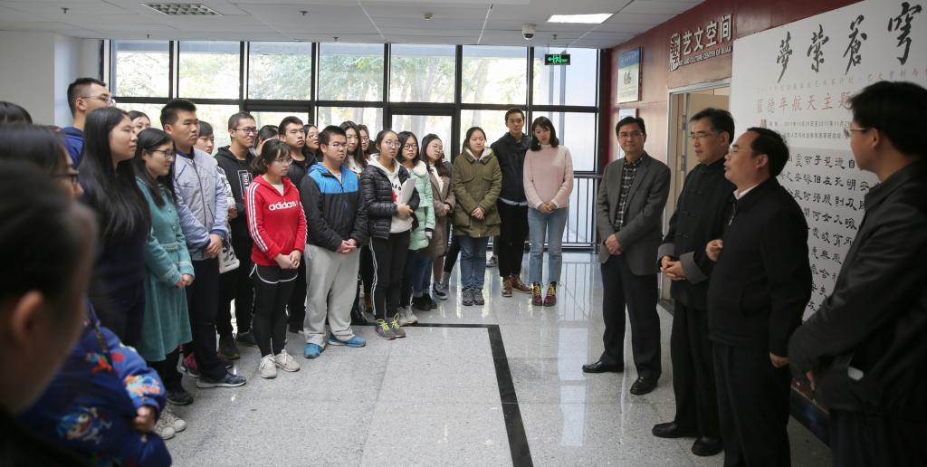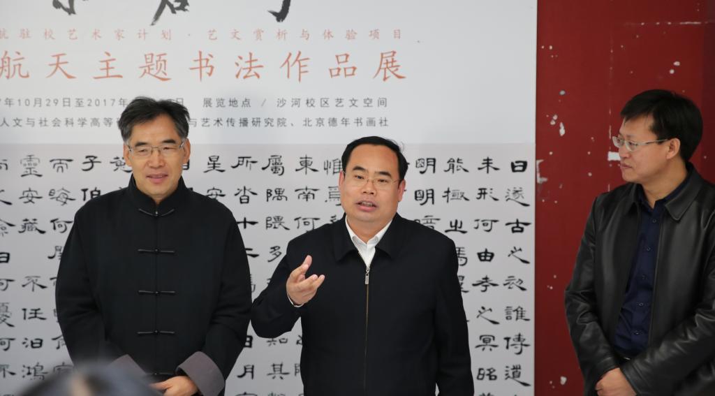 10月29日,深秋的北航沙河校区,美丽得像一幅幅五彩斑斓的油画,充满了浓浓的艺术气息。下午2时,在同样洋溢着艺术韵味的艺文空间,“梦萦苍穹——翟德年航天主题书法作品展”拉开了帷幕。北航党委副书记程基伟教授,北航高研院院长、文化与艺术传播研究院执行院长蔡劲松教授,高研院于金龙书记出席开幕式。翟德年先生在展览现场,向大家介绍了展出作品的创作情况。程基伟副书记对翟德年先生创作的书法作品给予了充分肯定和高度评价,并希望通过翟德年先生驻校期间在研修班的系统讲授和实践创作指导,进一步激发同学们对中国传统文化及书法创作的热爱,提升学员的书法鉴赏能力和触类旁通的综合素质,让中国书法之美融入学生的校园生活,绽放出多彩的人文艺术之花。