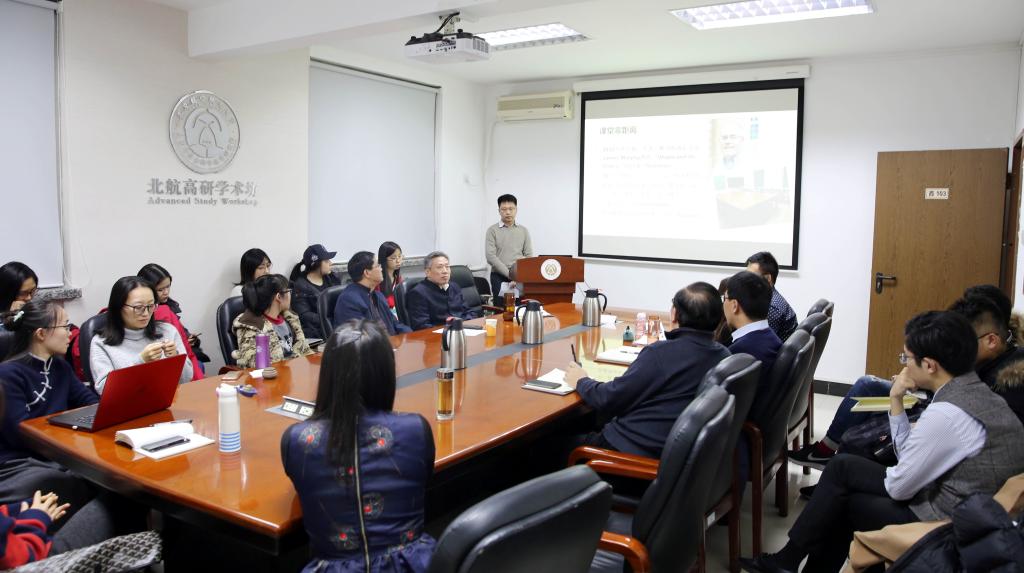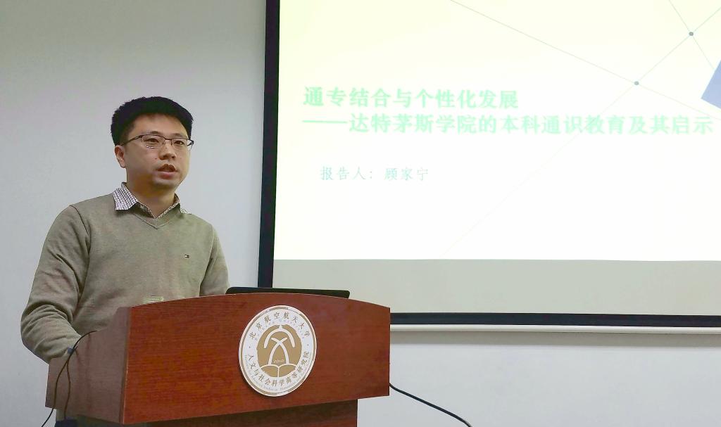2017年12月6日下午,北航人文与社会科学高等研究院在高研学术访举办学术沙龙,高研院顾家宁老师以《通专结合与个性化发展—达特茅斯学院的本科通识教育及其启示》为题为师生作精彩报告。蔡劲松院长、院学术委员会主任张耀南教授及部分教师、知行文科试验班本科生以及文化传播与管理专业研究生等近30人参加了沙龙研讨,本次“高研沙龙”由院长蔡劲松教授主持。