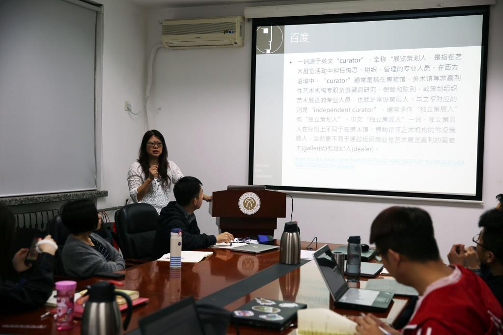 接着,曾钰涓博士根据4月8日高研院前往798艺术区的参观实践教学经历以及策展专业理论,介绍了策划艺术展的流程。具体分为五个步骤:规划期、布展期、开幕、展览期、撤展期。曾钰涓博士结合自己在台湾布展的经历,生动地让同学们对策展有了了解和学习。比如,在布展期的过程中,布展对工程顺序要求十分考究,其顺序应该为:木工进场、油漆工进场、电工进场、展品点收开箱、技术布展进场、艺术家进场、展品测试调教、输出•卡典西德贴字(展标)、清洁等等。这些都要求一位专业的策展人不仅仅要懂得艺术理论,更要有社会学、心理学、数学、行销学等等相关的知识和背景。