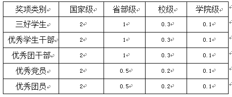 对于获得非上表所列荣誉的其他荣誉者,或未能获得任何学生荣誉但在学校各部处、校学生会担任半脱产学生干部、学生骨干一年以上且工作认真负责者,或在学院学生会担任学生干部、学生骨干一年以上且工作认真负责者,可向学院提出书面申请,由学院当年的“推免领导小组”讨论,并根据讨论结果裁定是否计分及计分额度(额度为0.1-0.3分)