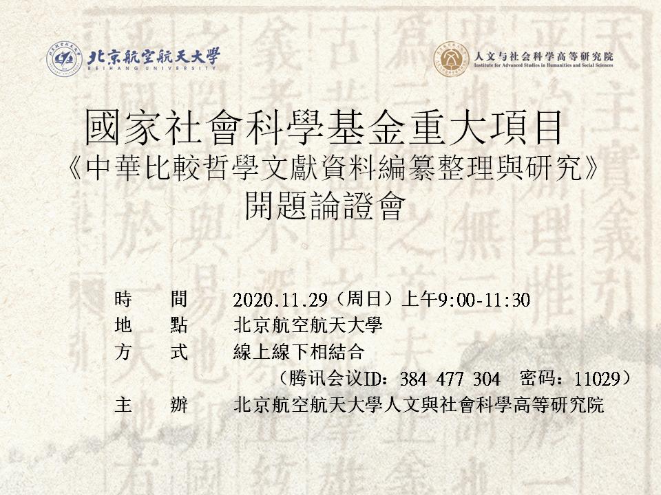 2020年11月29日上午,北航人文与社会科学高等研究院张耀南教授担任首席专家的2019年度国家社科基金重大项目《中华比较哲学文献资料编纂整理与研究》开题论证会在图书馆西配楼305高研学术坊顺利举办。开题论证会采用线上、线下相结合的方式举行。