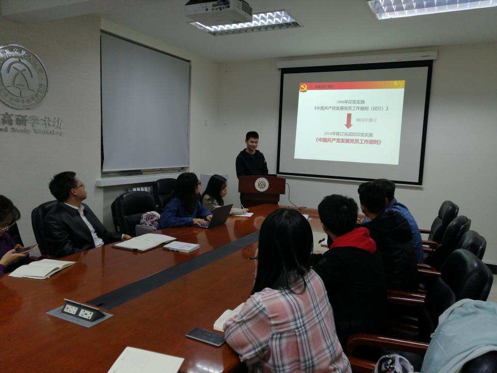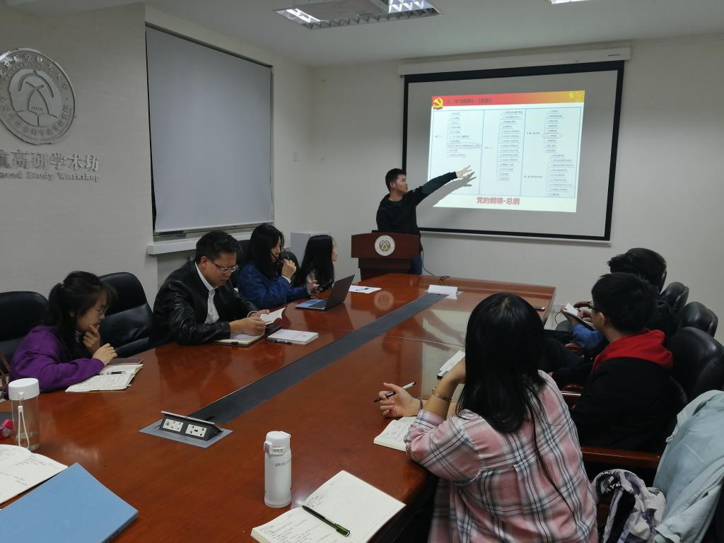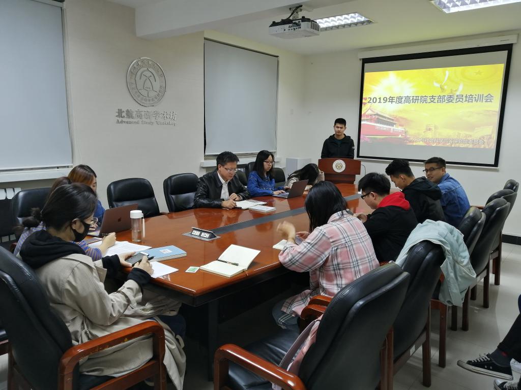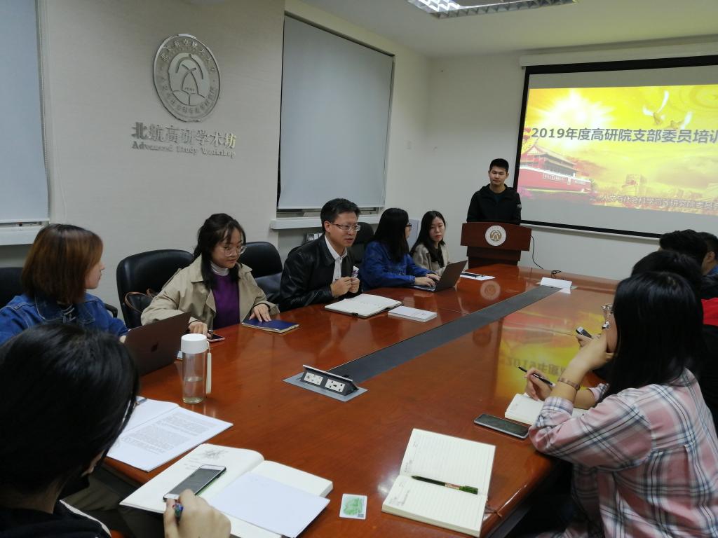 2019年10月18日晚19:00,北航人文与社会科学高等研究院党委召开2019年度高研院支部委员培训会。会议旨在从工作的实际需要出发,围绕发展党员的相关规定对支部委员进行系统培训,为近期扎实开展好向党推优、发展党员相关工作做好思想上和行动上的统一。本次会议由高研院党委书记于金龙主持,高研院2016级本科生党支部书记李家强主讲。高研院党委下辖各党支部委员14人参与培训。