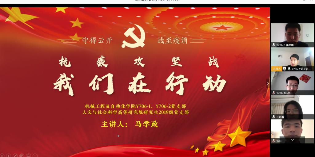 为进一步学习贯彻习近平总书记关于新冠肺炎疫情防控的系列重要讲话精神及学校学院党委关于疫情防控工作的相关部署要求,做好疫情期间基层党员思想政治工作,并探寻新模式下的创新党建模式,充分发挥学校“学习日”的学习引导作用。2020年3月25日,高研院研究生2019级党支部和机械学院机电系研究生第一、第二党支部联合召开了主题为“守得云开,战至疫消”的支部联合线上“学习日”。