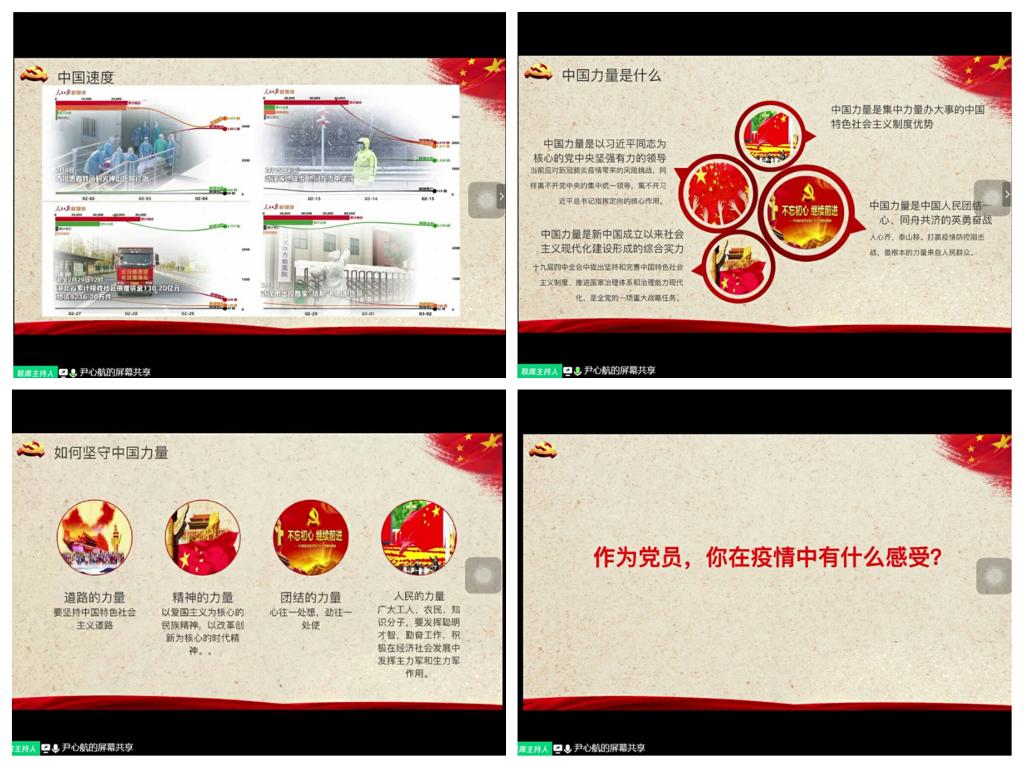 本科生党支部随后以“党员在疫情中的作用”为主题分享讨论,支部书记秦宇涛针对疫情期间的热门事件进行了分析与点评,重点从理解世界疫情局势,共建人类命运共同体出发,梳理了中国在抗疫过程中取得的重大成果和为世界做出的巨大贡献,有效回应了借机抹黑我国形象的行为。纪律委员李家强分享了自己的感悟《这是你的战争》,与会同学也积极分享了自己参与此次抗疫战役的亲身经历和本人在疫情中应起到的作用等。2017级文实班以此契机组织开展了向党推优活动,在讨论中学习,在分享中进步,不仅向党组织推荐了优秀同志,还帮助同学们将此次学习内容入心入脑。