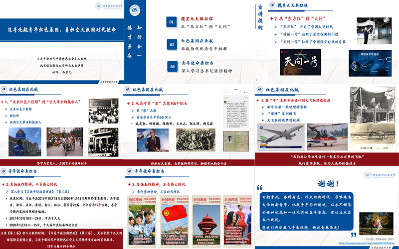 主题讲座分为三个部分。第一部分“揽星九天新征程”,杨苏凡同志从“东方红”开启了我国的太空时代,到“天问一号”火星探测器的成功发射为切入点,阐述了我国航天事业目前面临的机遇和挑战;第二部分“红色基因在北航”,杨苏凡同志结合北航校史和《口述北航》视频资料,讲述了历代北航优秀青年空天报国的故事,为大家解读了敢为人先的北航精神,号召同学们传承、发扬前辈们不忘初心、严谨治学、勇于创新的优秀品质;第三部分“青年使命勇担当”,杨苏凡同志结合《习近平谈治国理政》第三卷中“发扬五四精神,不负伟大时代”的相关资料,勉励大家肩负起新时代北航青年的责任,应当不忘“空天报国,敢为人先”的初心和使命,为祖国空天事业添砖加瓦,不负时代所托。